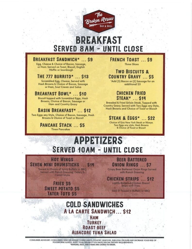 Tantalize your taste buds at the Broken Arrow Grill. Offering breakfast all-day, lunch and dinner. We aim to please when your appetite calls.